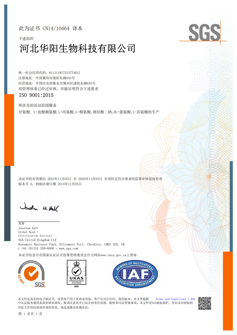 河北華陽集團坐落于河北省衡水市冀州區(qū)省級工業(yè)園區(qū)(始建于1987年,前身為冀州市華陽化工有限責任公司)。集團下屬四個公司:河北華陽生物科技有限公司、河北華悅氨基酸科技有限公司、滄州華晨生物科技有限公司、衡水市陽力商貿(mào)有限公司。主要生產(chǎn)甘氨酸、L-丙氨酸、L-蘇氨酸、DL-蛋氨酸、L-賴氨酸鹽酸鹽、L-半胱氨酸鹽酸鹽、干貝素等氨基酸系列食品級產(chǎn)品,廣泛應(yīng)用于食品、飲料、飼料等行業(yè)。......
